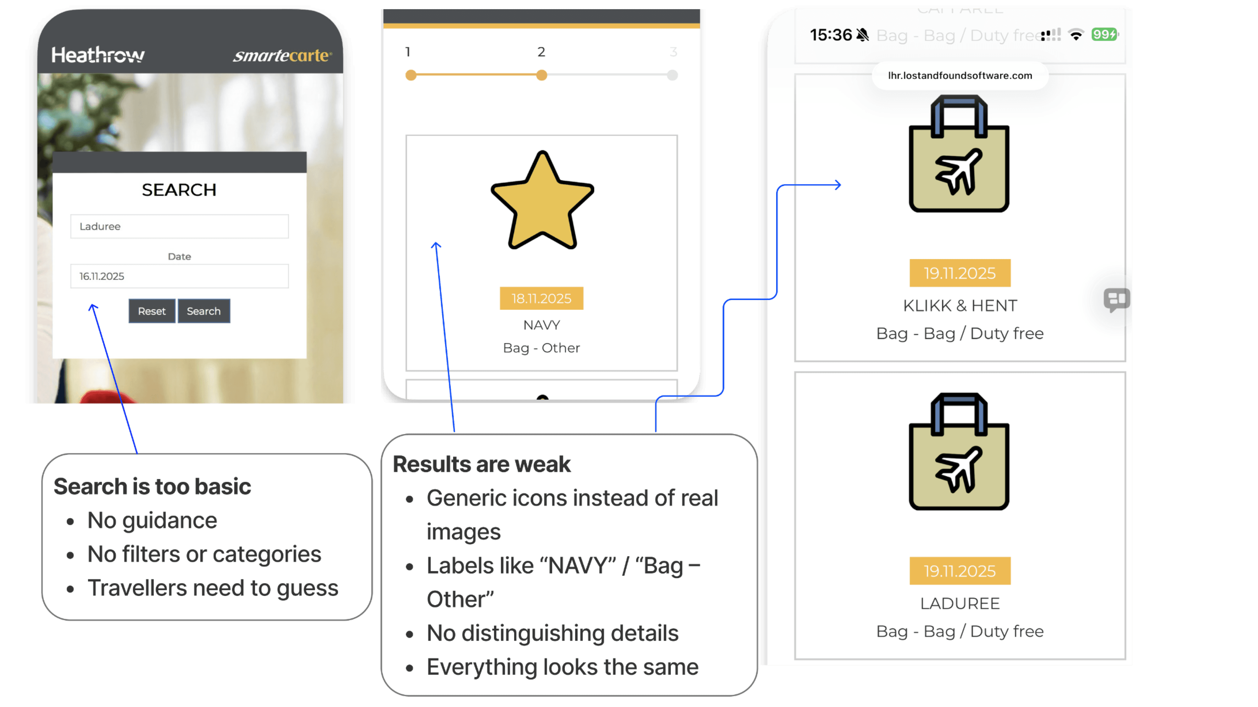 The current SmarteCarte experience creates friction for users in an already stressful situation. Vague item descriptions and limited visuals make it difficult to confidently identify belongings.